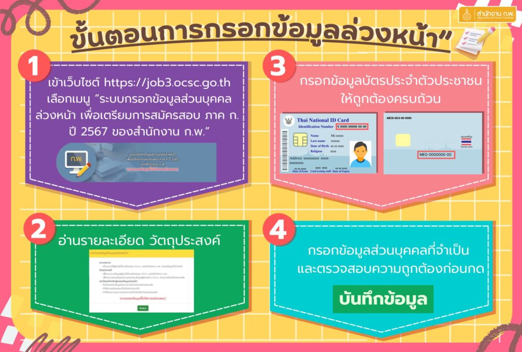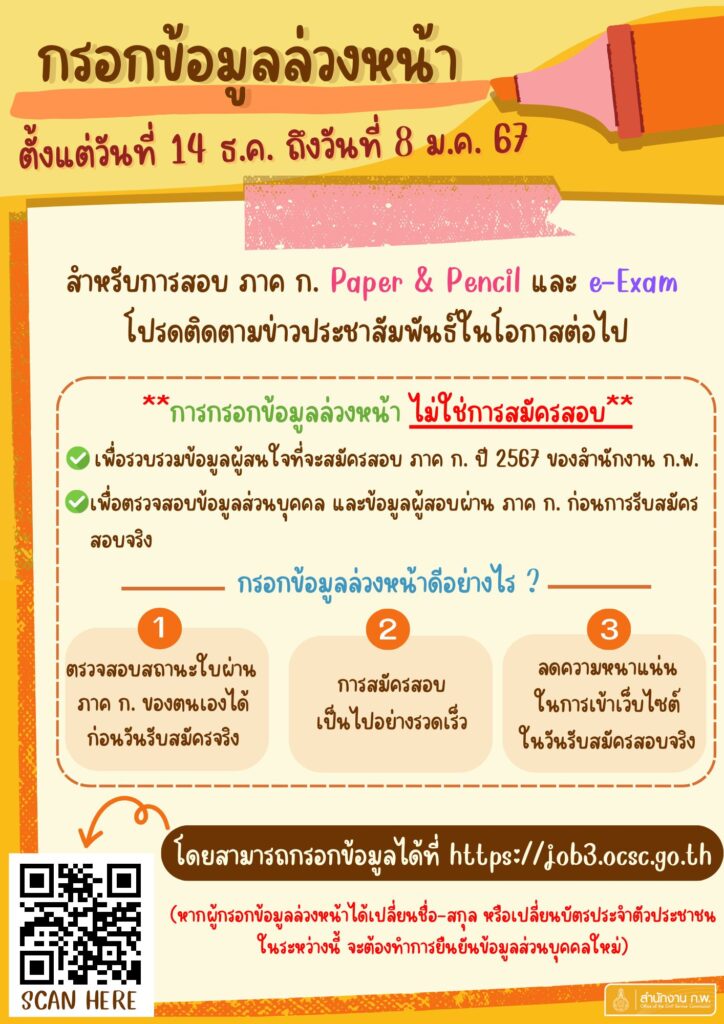 *หมายเหตุ: “การกรอกข้อมูลล่วงหน้า” เป็นเพียงการอำนวยความสะดวกให้ผู้สมัครสอบไม่ต้องกรอกเอกสารจำนวนมากและลดระยะเวลาในวันสมัครสอบจริงเท่านั้น ***ยังไม่ใช่การสมัครสอบภาค ก.***