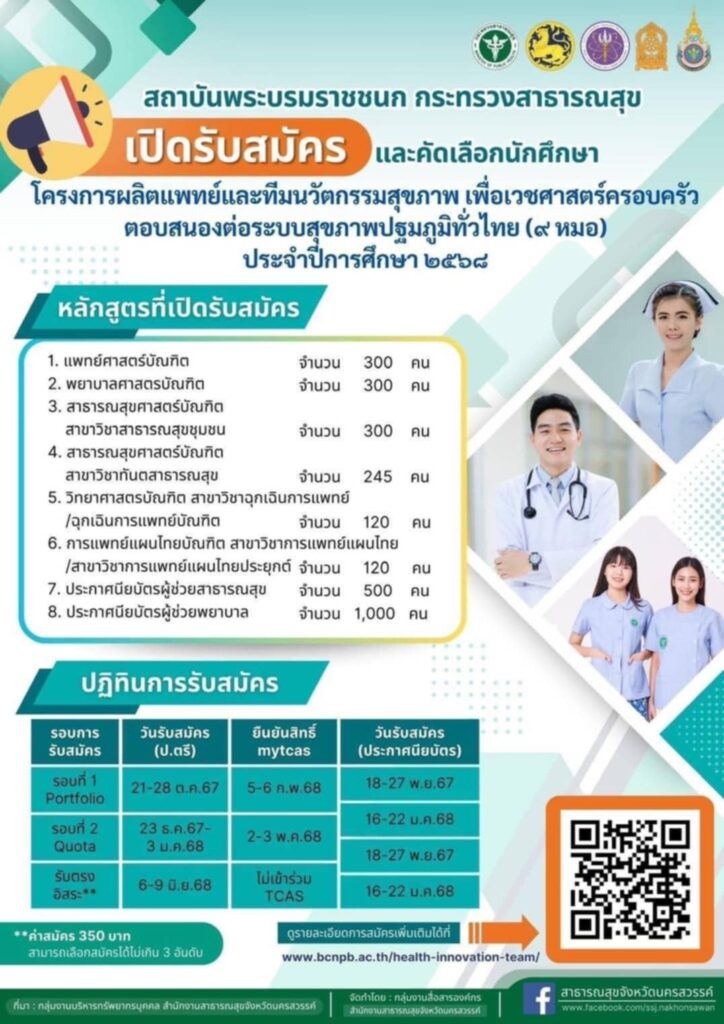 สถาบันพระบรมราชชนก กระทรวงสาธารณสุข เปิดรับสมัคร และคัดเลือกนักศึกษาโครงการผลิต แพทย์และทีมนวัตกรรมสุขภาพ เพื่อเวชศาสตร์ครอบครัว ตอบสนองต่อระบบสุขภาพปฐมภูมิทั่วไป (๙ หมอ) 2568