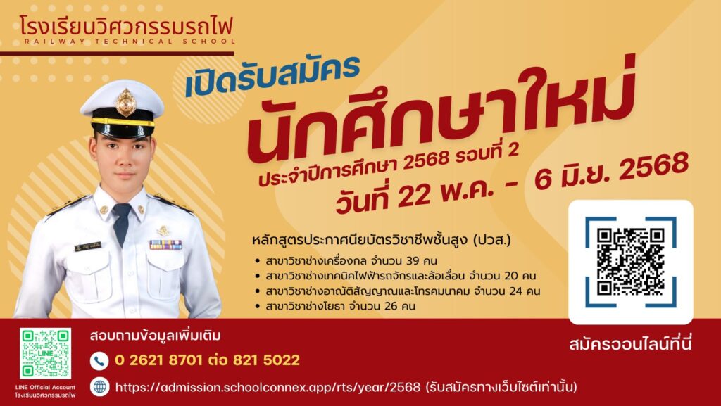 ประกาศโรงเรียนวิศวกรรมรถไฟ เรื่อง การเปิดรับสมัครนักเรียนวิศวกรรมรถไฟ ประจำปีการศึกษา 2568 รอบที่ 2