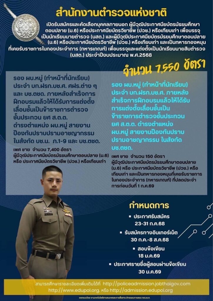 สำนักงานตำรวจแห่งชาติ เปิดรับสมัครและคัดเลือกบุคคลภายนอก ผู้มีวุฒิประกาศนียบัตรม้รยมศึกษาตอนปลาย (ม.6) หรือประกาศนียบัตรวิชาชีพ (ปวช.) หรือเทียบเท่า เพื่อบรรรจุเป็นนักเรียนนายตำรวจ (นสต.) และผู้มีวุฒิประกาศนียบัตรม้รยมศึกษาตอนปลาย(ม.6) หรือประกาศนียบัตรวิชาชีพ (ปวช.) หรือเทียบเท่า และเป็นทหารกองหนุนที่เคยรับราชการในกองประจำการ (ทหารเกณฑ์) เพื่อบรรจุและแต่งตั้งเป็นนักเรียนนายสิบตำรวจ (นสต.) ประจำปึงบประมาณ พ.ศ.2568