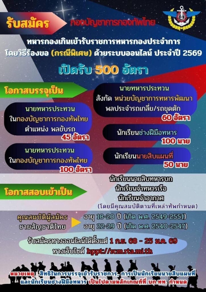 กองบัญชาการกองทัพไทย เปิดรับสมัครชายไทย สอบคัดเลือกเข้าเป็นทหารกองเกินเข้ารับราชการกองประจำการ โดยวิธีร้องขอ (กรณีพิเศษ) ด้วยระบบออนไลน์ ปี 2569 จำนวน 500 อัตรา